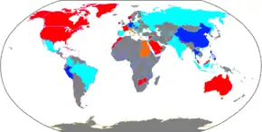 Metamizole's legal status by country in 2014 Grey: No data; likely over-the-counter if the country is not developed, otherwise likely banned. Light blue: over-the-counter with limited restrictions. Blue: Prescription-only, with fairly limited restrictions on its use. Orange: Prescription-only, with extensive restrictions on its use. Red: complete ban.[13]