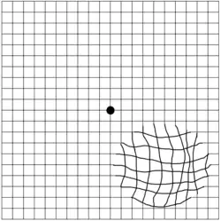 Metamorphopsia (from Ancient Greek: μεταμορφοψία, metamorphopsia, 'seeing mutated shapes') is a type of distorted vision in which a grid of straight lines appears wavy or partially blank. In addition, metamorphopsia can result in misperceptions of an object's size, shape,[3] or distance to the viewer. People can first notice they suffer from the condition when looking at mini blinds in their home.