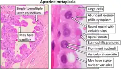 - ↑ Image by Mikael Häggström, MD. Reference for findings: Diez Freire CC, Masood S. Zynger DL (ed.). "Apocrine metaplasia". Pathology Outlines. Last author update: 28 May 2020.