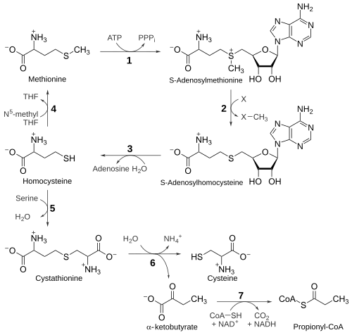 - ↑ Finkelstein JD (May 1990). "Methionine metabolism in mammals". The Journal of Nutritional Biochemistry. 1 (5): 228–237. doi:10.1016/0955-2863(90)90070-2. PMID 15539209. S2CID 32264340.
