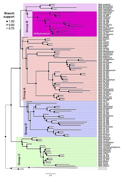 - ↑ Alleman AB, Stolyar S, Marx CJ, Leducq JB (2025). "Led astray by 16S rRNA: phylogenomics reaffirms the monophyly of Methylobacterium and lack of support for Methylorubrum as a genus". ISME J. 19. doi:10.1093/ismejo/wraf011. PMC 11833323. PMID 39834026.