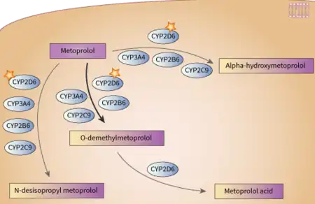 - ↑ Blake CM, Kharasch ED, Schwab M, Nagele P (Sep 2013). "A meta-analysis of CYP2D6 metabolizer phenotype and metoprolol pharmacokinetics". Clin Pharmacol Ther. 94 (3): 394–9. doi:10.1038/clpt.2013.96. PMC 3818912. PMID 23665868.