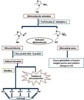 Metronidazole is of the nitroimidazole class. It inhibits nucleic acid synthesis by forming nitroso radicals, which disrupt the DNA of microbial cells.[3][49] This function only occurs when metronidazole is partially reduced, and because this reduction usually happens only in anaerobic bacteria and protozoans, it has relatively little effect upon human cells or aerobic bacteria.[50]