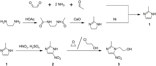 2-Methylimidazole (1) may be prepared via the Debus-Radziszewski imidazole synthesis, or from ethylenediamine and acetic acid, followed by treatment with lime, then Raney nickel. 2-Methylimidazole is nitrated to give 2-methyl-4(5)-nitroimidazole (2), which is in turn alkylated with ethylene oxide or 2-chloroethanol to give metronidazole (3):[55][56][57]