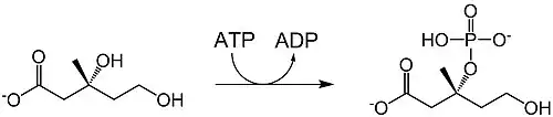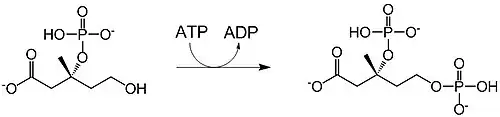 | mevalonate-3-phosphate-5-kinase | ![]() | Mevalonate-3-phosphate is phosphorylated at the 5-OH position to yield mevalonate-5-phosphate (also called phosphomevalonic acid). 1 ATP is consumed. |