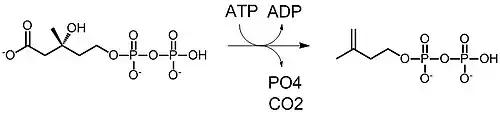 | mevalonate-5-pyrophosphate decarboxylase | ![]() | Mevalonate-5-pyrophosphate is decarboxylated to yield isopentenyl pyrophosphate (IPP). 1 ATP is consumed. |