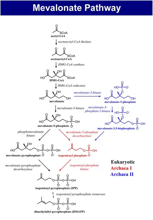 The lower mevalonate pathway which converts (R)-mevalonate into IPP and DMAPP has 3 variants. In eukaryotes, mevalonate is phosphorylated twice in the 5-OH position, then decarboxylated to yield IPP.[4] In some archaea such as Haloferax volcanii, mevalonate is phosphorylated once in the 5-OH position, decarboxylated to yield isopentenyl phosphate (IP), and finally phosphorylated again to yield IPP (Archaeal Mevalonate Pathway I).[5] A third mevalonate pathway variant found in Thermoplasma acidophilum, phosphorylates mevalonate at the 3-OH position followed by phosphorylation at the 5-OH position. The resulting metabolite, mevalonate-3,5-bisphosphate, is decarboxylated to IP, and finally phosphorylated to yield IPP (Archaeal Mevalonate Pathway II).[6][7]