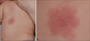 Meyerson nevus is a noncancerous patch, occurring typically on the chest and back.[3][4] It appears as an itchy mole surrounded by a red and scaly halo, in a young adult.[2]