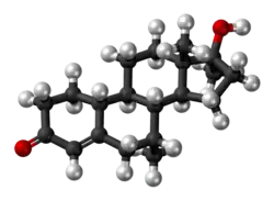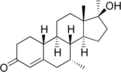 Mibolerone, also known as 7α,17α-dimethyl-19-nortestosterone (DMNT) or as 7α,17α-dimethylestr-4-en-17β-ol-3-one,[8] is a synthetic estrane steroid and a 17α-alkylated derivative of nandrolone (19-nortestosterone). It is the 17α-methyl derivative of trestolone (7α-methyl-19-nortestosterone; MENT).[8] Other related AAS include metribolone (17α-methyl-δ9,11-19-nortestosterone) and dimethyltrienolone (7α,17α-dimethyl-δ9,11-19-nortestosterone).