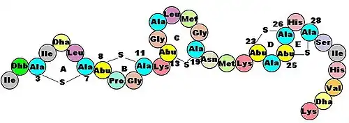 - ↑ Castiglione, Franca; Lazzarini, Ameriga; Carrano, Lucia; Corti, Emiliana; Ciciliato, Ismaela; Gastaldo, Luciano; Candiani, Paolo; Losi, Daniele; Marinelli, Flavia (2008-01-25). "Determining the Structure and Mode of Action of Microbisporicin, a Potent Lantibiotic Active Against Multiresistant Pathogens". Chemistry & Biology. 15 (1): 22–31. doi:10.1016/j.chembiol.2007.11.009. PMID 18215770.