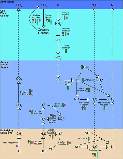Biological productivity (photosynthesis) in marine ecosystems is often limited by the bioavailability of nitrogen.[6] The amount of bioavailable nitrogen (nitrate (NO3−), nitrite (NO2−), and ammonium (NH4+)) depends on the inputs from nitrogen fixation and losses from denitrification and anammox as dinitrogen gas (N2), a compound only accessible to nitrogen-fixing bacteria.[7][6] N2 production from denitrification and anammox closes the nitrogen cycle by reducing the nitrogen available in organic matter fixed by phytoplankton at the surface ocean. Denitrification in OMZs leads to a significant loss of inorganic nitrogen from the oceans, limiting growth/productivity in many regions around the world. OMZs are known for their role in the global nitrogen cycle. As no oxygen is present to fuel aerobic respiration, anoxic systems are primarily dominated by microbially-mediated nitrogen cycling.