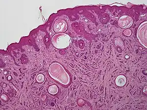 - ↑ 1.0 1.1 1.2 1.3 Hamed, Nouran S.; Khachemoune, Amor (2015-07-01). "Microcystic adnexal carcinoma: A focused review and updates". Journal of Dermatology & Dermatologic Surgery. 19 (2): 80–85. doi:10.1016/j.jdds.2015.03.001. ISSN 2352-2410.
