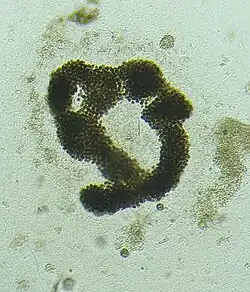 Microcystis aeruginosa is a species of freshwater cyanobacteria that can form harmful algal blooms of economic and ecological importance. They are the most common toxic cyanobacterial bloom in eutrophic fresh water. Cyanobacteria produce neurotoxins and peptide hepatotoxins, such as microcystin and cyanopeptolin.[1] Microcystis aeruginosa produces numerous congeners of microcystin, with microcystin-LR being the most common.[2] Microcystis blooms have been reported in at least 108 countries, with the production of microcystin noted in at least 79.[3]
