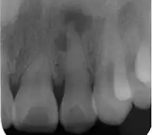 Radiograph (X-ray) showing microdontia. Note also periapical lesion on the maxillary left lateral incisor.