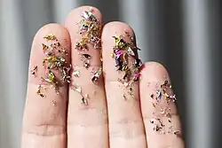 Airborne MNPs originate from urban dust, synthetic fibers from textiles, rubber tires, and household plastic items.[15][9] These airborne particles may become suspended in the air due to wave action in aquatic environments or the spread of wastewater treatment sludge on agricultural fields.[11] Once inhaled, these particles may lodge in the lungs or, through mucociliary clearance, be ingested and enter the digestive system.[16][17][18] Airborne microplastics have been detected in urban atmospheres, with reports showing a fallout of 29–280 particles per square meter per day on an urban rooftop, underscoring the potential for routine exposure.[4] Annual inhalation exposure rates are estimated at 39,000–52,000 microplastic particles, with studies highlighting the significant contributions from synthetic textiles and urban dust sources.