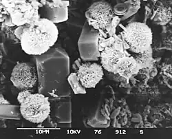 - ↑ Grobe/AWI, Hannes (1980-04-07), SEM photomicrograph of Arnager Kalk ("Arnager Limestone") from the Upper Cretaceous of Bornholm, Denmark: close up of prismatic crystals and spheroidal aggregates of unidentified authigenic minerals., retrieved 2022-05-27