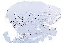- ↑ Nephron, English: Very low magnification micrograph of cerebral amyloid angiopathy with senile plaques in the cerebral cortex consistent of amyloid beta, as may be seen in Alzheimer disease. Amyloid beta immunostain., retrieved 2022-05-27