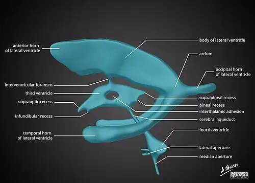 Ventricular system anatomy showing the cerebral aqueduct, labelled centre right.