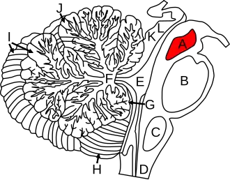 Figure shows the midbrain (A) and surrounding regions; sagittal view of one cerebellar hemisphere. B: Pons. C: Medulla. D: Spinal cord. E: Fourth ventricle. F: Arbor vitae. G: Nodule. H: Tonsil. I: Posterior lobe. J: Anterior lobe. K: Inferior colliculus. L: Superior colliculus.