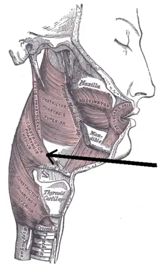 • Its role in Hyoid bone syndrome: Ernest, Edwin A.; Salter, E. George (1991). "Hyoid bone syndrome: A degenerative injury of the middle pharyngeal constrictor muscle with photomicroscopic evidence of insertion tendinosis". The Journal of Prosthetic Dentistry. 66 (1): 78–83. doi:10.1016/0022-3913(91)90357-3. ISSN 0022-3913. PMID 1941681.
