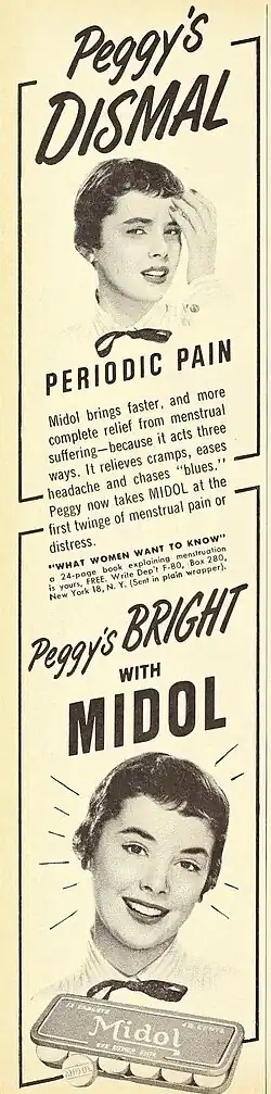 - ↑ "Midol ad for Menstrual problems". Archived from the original on 2012-07-08. Retrieved 2010-07-03.