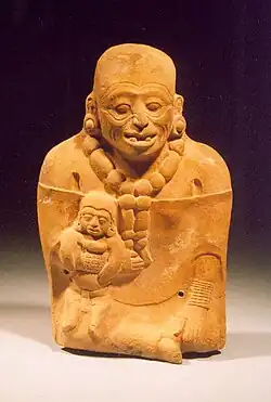 In Maya society, it is believed that midwives receive their calling from God in a series of dreams. These visions are believed to often include subtle hints that a woman is destined to become a midwife and can include visions of Saint Anne who is the saint of all midwives.[2] According to the Mayan religion, in addition to receiving dreams and visions, women also tend to find small items in paths that are symbols and objects related to midwifery. The objects are often small unusual stones that resemble the shape of a face, shells, marbles or broken fragments of archaeological figurines.[3] Stones are often given sacred powers in the Maya religion and are believed to be sent from the spiritual world as a sign of one's calling to midwifery.[2] It is also believed that some objects left in a midwife's path may also be the tools they need to perform parts of the birthing, i.e. a penknife that is used to cut the umbilical cord. Women often consult shamans who explain their calling to them, and after the women accept that they are to become midwives, they are believed to receive another series of dreams and visions regarding the birthing practices they must follow. In addition to these special objects, and the repetitious dreams, it is believed that they may also be summoned to mountains or other sacred places where they may encounter supernatural beings.[3] Mayans believe that women who ignore their calling often fall ill, and if doctors are unable to determine a diagnosis for their ailments, they may even face death. They also believe that they are told in their dreams by supernatural beings that they will receive gifts from the families of the children they deliver, and that they must not be greedy; because many will give what they have, it must be accepted with a goodness of heart.[4]