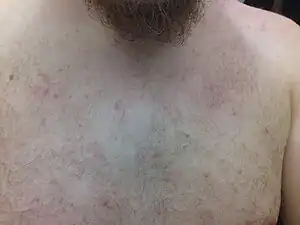 The most commonly encountered form of the illness is miliaria rubra, in which obstruction causes leakage of sweat into the deeper layers of the epidermis, provoking a local inflammatory reaction and giving rise to the typical appearance of redness (hence rubra) and larger (but still only a few millimetres), blister-like lesions. This form of the illness is often accompanied by the typical symptoms—intense itching or "pins and needles" with a lack of sweating (anhidrosis) to affected areas.[5]: 23 There is a small risk of heat exhaustion due to inability to sweat if the rash affects a large proportion of the body's surface area or the sufferer continues to engage in heat-producing activity. Miliaria rubra is also known as prickly heat and heat rash.[7] Differential diagnosis should be used to rule out polycythemia vera, which is a rare hematological disorder and appears more often in males than females, generally not before the age of 40. Both disorders share the common denominator of appearing after taking a hot shower.
