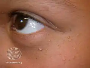 | Symptoms | Single or multiple small 1-2mm pearly-white bumps usually on face and and around eyes[1] |