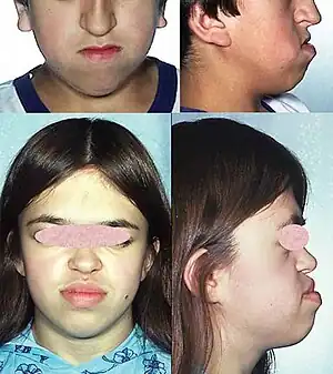 The brain is abnormally smooth, with fewer folds and grooves. The face, especially in children, has distinct characteristics including a short nose with upturned nares, thickened upper lip with a thin vermilion upper border, frontal bossing, small jaw, low-set posteriorly rotated ears, sunken appearance in the middle of the face, widely spaced eyes, and hypertelorism. The forehead is prominent with bitemporal hollowing.[3]