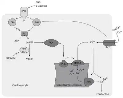 Milrinone is a phosphodiesterase-3 inhibitor. This drug inhibits the action of phosphodiesterase-3 and thus prevents degradation of cAMP. With increased cAMP levels there is an increase in the activation of PKA. This PKA will phosphorylate many components of the cardiomyocyte such as calcium channels and components of the myofilaments. Phosphorylation of calcium channels permits an increase in calcium influx into the cell. This increase in calcium influx results in increased contractility. PKA also phosphorylates potassium channels promoting their action. Potassium channels are responsible for repolarization of the cardiomyocytes therefore increasing the rate at which cells can depolarize and generate contraction. PKA also phosphorylates components on myofilaments allowing actin and myosin to interact more easily and thus increasing contractility and the inotropic state of the heart. Milrinone allows stimulation of cardiac function independently of β-adrenergic receptors which appear to be down-regulated in those with heart failure.