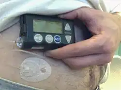Insulin pumps are drug delivery devices used to treat patients with type 1 and type 2 diabetes. The Minimed Paradigm REAL-Time and Continuous Glucose Monitoring (CGM) system, which received FDA clearance in 2006, uses tubing and a reservoir with rapid-acting insulin. This "infusion set" is patient-connected via a catheter to the abdomen region. The infusion set can remain in the place for three days while the pump is clip-belt worn. There is a quick-disconnect feature for the tubing. The pump delivers insulin in two modes. In basal rate mode, the delivery is continuous in small doses similar to a pancreas, for example 0.15 units per hour throughout the day. Basal rates are set to meet individual metabolic rates. In bolus mode, the delivery is programmed to be a one-time delivery prior to eating or after an unexpected high, for example 18 units spread out to several hours. This type of continuous treatment is in contrast to traditional multiple daily injections (MDI) that use slower-acting insulin. Continuous treatment reduces glucose variability.[5]