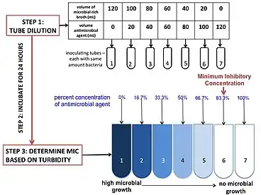 There are three main reagents necessary to run this assay: the media, an antimicrobial agent, and the microbe being tested. The most commonly used media is cation-adjusted Mueller Hinton Broth, due to its ability to support the growth of most pathogens and its lack of inhibitors towards common antibiotics.[22] Depending on the pathogen and antibiotics being tested, the media can be changed and/or adjusted. The antimicrobial concentration is adjusted into the correct concentration by mixing stock antimicrobial with media. The adjusted antimicrobial is serially diluted into multiple tubes (or wells) to obtain a gradient. The dilution rate can be adjusted depending on the breakpoint and the practitioner's needs. The microbe, or the inoculating agent, must come from the same colony-forming unit, and must be at the correct concentration. This may be adjusted by incubation time and dilution. For verification, the positive control is plated in a hundred fold dilution to count colony forming units. The microbes inoculate the tubes (or plate) and are incubated for 16–20 hours. The MIC is generally determined by turbidity.[22]