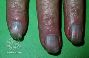 Minocycline may cause upset stomach, diarrhea, dizziness, unsteadiness, drowsiness, mouth sores, headache, and vomiting. It increases sensitivity to sunlight, and may affect the quality of sleep and rarely causes sleep disorders.[30] It has also been linked to cases of lupus.[31] Prolonged use of minocycline can lead to blue-gray staining of skin, fingernails, and scar tissue. This staining is not permanent, but can take a very long time for the skin color to return to normal; however, a muddy brown skin color in sun-exposed areas is usually permanent.[32] Permanent blue discoloration of gums or teeth discoloration may also occur. Rare but serious side effects include fever, yellowing of the eyes or skin, stomach pain, sore throat, vision changes, and mental changes, including depersonalization.[33][34]
