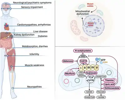 {{cite journal}}: CS1 maint: unflagged free DOI (link) - ↑ Muraresku, CC; McCormick, EM; Falk, MJ (June 2018). "Mitochondrial Disease: Advances in clinical diagnosis, management, therapeutic development, and preventative strategies". Current genetic medicine reports. 6 (2): 62–72. doi:10.1007/s40142-018-0138-9. PMID 30393588. Archived from the original on 2023-05-24. Retrieved 2024-04-17.