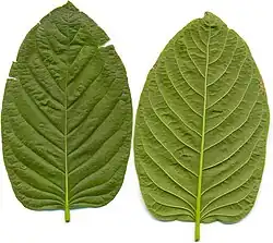 Mitragyna speciosa is an evergreen tree in the genus Mitragyna that can grow to a height of 25 m (82 ft). Its trunk may grow to a 0.9 m (3 ft) diameter.[21] The trunk is generally straight, and the outer bark is smooth and grey.[21] The leaves, ovate-acuminate in shape and opposite in growth pattern, are dark green, glossy on their upper surfaces,[11] and can grow to over 14–20 cm (5.5–7.9 in) long and 7–12 cm (2.8–4.7 in) wide. They have 12 to 17 pairs of veins.[21] The spherical inflorescences, which are deep yellow, grow in clusters of three at the ends of the branches.[22] The calyx-tube is 2 mm (0.08 in) long and has five lobes; the corolla-tube is 2.5–3 millimetres (0.098–0.12 in) long.[21]