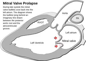 Mitral valve prolapse (MVP) is a valvular heart disease in which mitral valve leaflets enter into the left atrium when the ventricle contracts.[1] Symptoms vary from none, to chest pain, shortness of breath, palpitations, and anxiety.[1][3] Complications may include mitral regurgitation, atrial fibrillation, infective endocarditis, stroke, and cardiac arrest.[1]