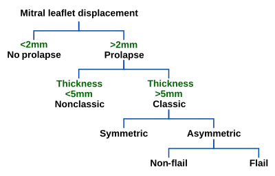 Prolapsed mitral valves are classified into several subtypes, based on leaflet thickness, type of connection to the mitral annulus, and concavity. Subtypes can be described as classic, nonclassic, symmetric, asymmetric, flail, or non-flail.[35]