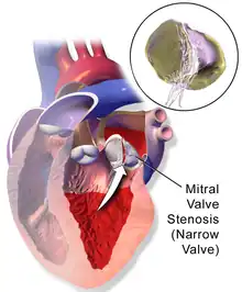Mitral stenosis is a type of valvular heart disease in which there is narrowing of the mitral valve opening.[1] Onset is generally gradual.[1] The most common symptom is shortness of breath, particularly at night or when lying down.[1] Other symptoms may include palpitations, tiredness, chest pain, coughing up blood, and swelling.[1] Complications may include pulmonary hypertension, atrial fibrillation, and heart failure.[1]