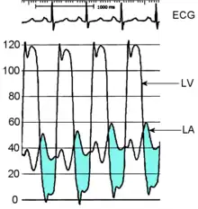 When the mitral valve area goes below 2 cm2, the valve causes an impediment to the flow of blood into the left ventricle, creating a pressure gradient across the mitral valve. This gradient may be increased by increases in the heart rate or cardiac output. As the gradient across the mitral valve increases, the amount of time necessary to fill the left ventricle with blood increases. Eventually, the left ventricle requires the atrial kick to fill with blood. As the heart rate increases, the amount of time that the ventricle is in diastole and can fill up with blood (called the diastolic filling period) decreases. When the heart rate goes above a certain point, the diastolic filling period is insufficient to fill the ventricle with blood and pressure builds up in the left atrium, leading to pulmonary congestion.
