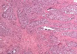 There is debate over the naming of MMMT; the term carcinosarcoma was formerly used to describe lesions with homologous tumors, and "malignant mixed Müllerian tumor" or "mixed mesodermal tumor" was used to describe heterologous tumors. While "carcinosarcoma" now considered standard, "malignant mixed Müllerian tumor" has a lengthy history within gynecological literature and is expected to continue to be used. The naming issue to a certain extent reflects histological characteristics and development of the tumors, in which the different types of tissues are believed to either develop separately and join into a single mass (the "collision" theory), that an adenocarcinoma stimulates the stroma to create a tumor (the "composition" theory), or that the tumor is the result of a stem cell that differentiates into different cell types (the "combination" theory).[1] "Collision" tumors are normally easily recognized and not considered true MMMTs; the "combination" theory is most widely held, and is due to evidence that the tumors develop from a single line of cells, developing in a fashion similar to the fundus of the uterus from the Müllerian duct – first from a stem cell into a population of cells, that then differentiates into epithelial and stromal components.[1][2]
