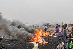 Waste pickers burning e-waste in Agbogbloshie, a site near Accra in Ghana that processes large volumes of international electronic waste. The pickers burn the plastics off of materials and collect the metals for recycling, However, this process exposes pickers and their local communities to toxic fumes.