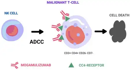 In terms of the mode of action of Mogamulizumad we find that it targets CCR4 that is found on surface of T-cell lymphocytes(some T cells become cancerous). Mogamulizumab attracts the immune system to attack the cancerous T cells. Additionally, it blocks the signals that CCR4 sends inside cells, which are signals that help the T cells to survive and multiply.[9]