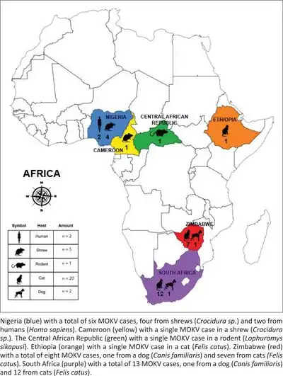 MOKV was first isolated in Nigeria, in 1968, from three shrews (Crocidura species) found in the Mokola forest, Ibadan, Oyo State, Nigeria. The virus was shown to be morphologically and serologically related to rabies virus. Since the initial isolation of MOKV, the virus has been mainly isolated in domestic cats and small mammals in sub-Saharan Africa.[4]
