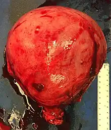 Molar pregnancy is a form of pregnancy were a non-viable fertilized egg implants in the uterus and the placenta forms a tumor.[2] They may be complete or less commonly partial.[2] A complete mole diagnosed in the second trimester may present with an overly large uterus, low red blood cells, vomiting, high blood pressure, hyperthyroidism, and breathing problems.[1] With earlier diagnosis or with an partial mole these symptoms are less common.[1] Well typically benign, they do have the potential to become cancer (15% to 20% with complete, 1% to 5% with partial).[2]