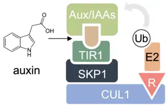 - 1 2 Tan X, Calderon-Villalobos LI, Sharon M, Zheng C, Robinson CV, Estelle M, et al. (April 2007). "Mechanism of auxin perception by the TIR1 ubiquitin ligase". Nature. 446 (7136): 640–645. Bibcode:2007Natur.446..640T. doi:10.1038/nature05731. PMID 17410169.