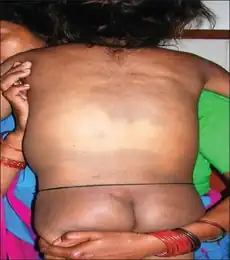 | Symptoms | Blue-gray in spots generally on the lower back[2][3] |