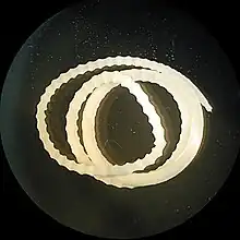 Acanthocephalans do not have digestive tracts and absorb nutrients through the tegument, the external layer. The scolex of this worm has a cylindrical proboscis and a multitude of curved hooks. The main parts of the worm body are the proboscis, neck, and trunk. Because of horizontal markings on the worm, there is the appearance of segmentation. Acanthocephalans are sexually dimorphic (dioecious) – adult males are generally 4 to 5 cm long while females are longer, ranging from lengths of 10 to 30 cm. Males also have copulatory bursas, used to hold on to the female during copulation and cement glands. Females have floating ovaries within a ligament sac where fertilization of the eggs occurs.[1] The eggs of this parasite are 90–125 μm long and 65 μm wide. They are oval in shape with a thick, clear outer coat.[2]