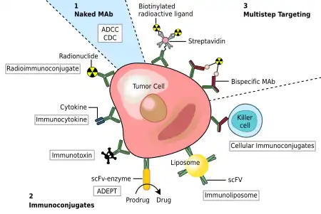 - ↑ Modified from Carter P (November 2001). "Improving the efficacy of antibody-based cancer therapies". Nature Reviews. Cancer. 1 (2): 118–129. doi:10.1038/35101072. PMID 11905803. S2CID 10169378.