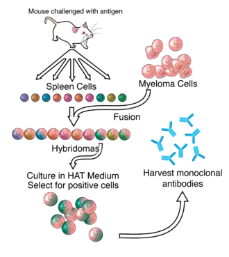 Much of the work behind production of monoclonal antibodies is rooted in the production of hybridomas, which involves identifying antigen-specific plasma/plasmablast cells that produce antibodies specific to an antigen of interest and fusing these cells with myeloma cells.[8] Rabbit B-cells can be used to form a rabbit hybridoma.[12][13] Polyethylene glycol is used to fuse adjacent plasma membranes,[14] but the success rate is low, so a selective medium in which only fused cells can grow is used. This is possible because myeloma cells have lost the ability to synthesize hypoxanthine-guanine-phosphoribosyl transferase (HGPRT), an enzyme necessary for the salvage synthesis of nucleic acids. The absence of HGPRT is not a problem for these cells unless the de novo purine synthesis pathway is also disrupted. Exposing cells to aminopterin (a folic acid analogue which inhibits dihydrofolate reductase) makes them unable to use the de novo pathway and become fully auxotrophic for nucleic acids, thus requiring supplementation to survive.