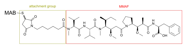 Monomethyl auristatin F is an antimitotic agent which inhibits cell division by blocking the polymerisation of tubulin. It is linked to an antibody with high affinity to structures on cancer cells, causing MMAF to accumulate in such cells.[3]